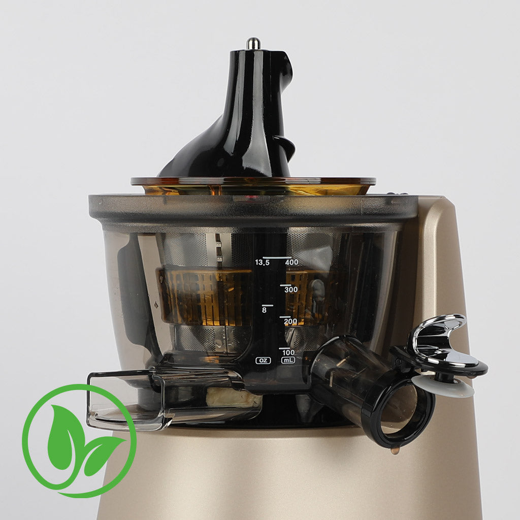 A masticating juicer with low-speed technology for nutrient-rich, longer-lasting juice. Enjoy hassle-free whole ingredient insertion, easy cleaning, and quiet operation.