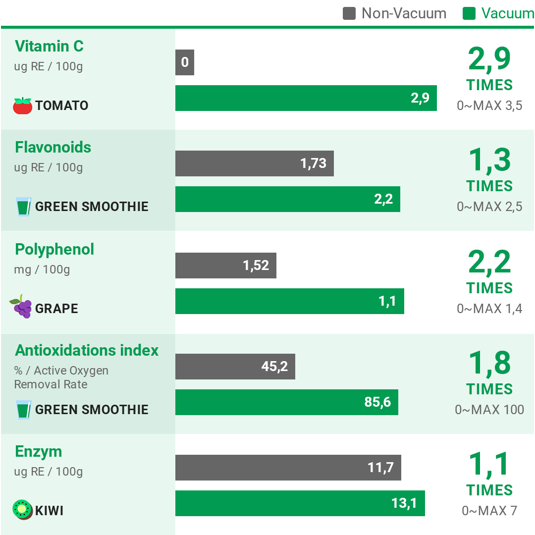 Teknologi vakum mencegah oksidasi makanan dan menjaga kadar vitamin serta nutrisi lebih tinggi dibandingkan blender sentrifugal konvensional.