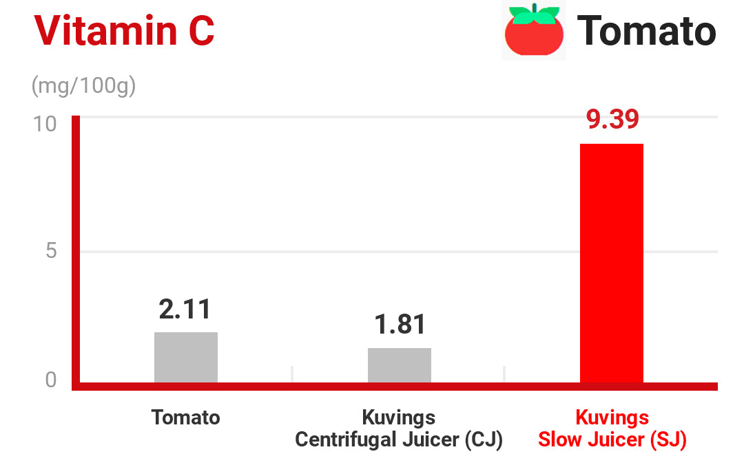 Kandungan vitamin C dalam jus yang dibuat dengan slow juicer 5,2 kali lebih tinggi dibandingkan jus dari juicer sentrifugal. Oksidasi adalah salah satu penyebab rendahnya kadar vitamin C.
