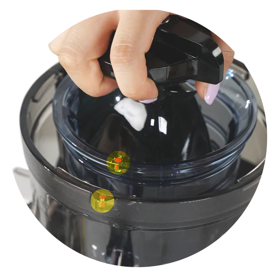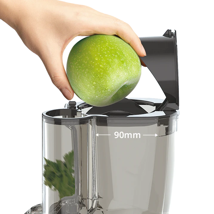 Corong 90mm yang lebih lebar bisa memasukkan buah dan sayur utuh tanpa dipotong, membuat proses membuat jus lebih cepat.