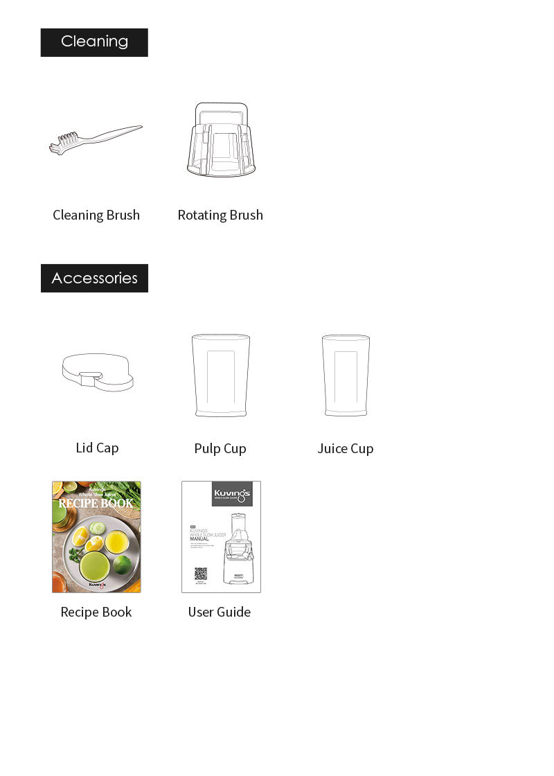 Isi dalam kotak: Penutup Durum Lid, Blade Screw, Sikat, Sikat Putar, Mangkuk Jus, Gelas Jus, Gelas Ampas, Kartu Garansi, Buku Manual, Buku Resep