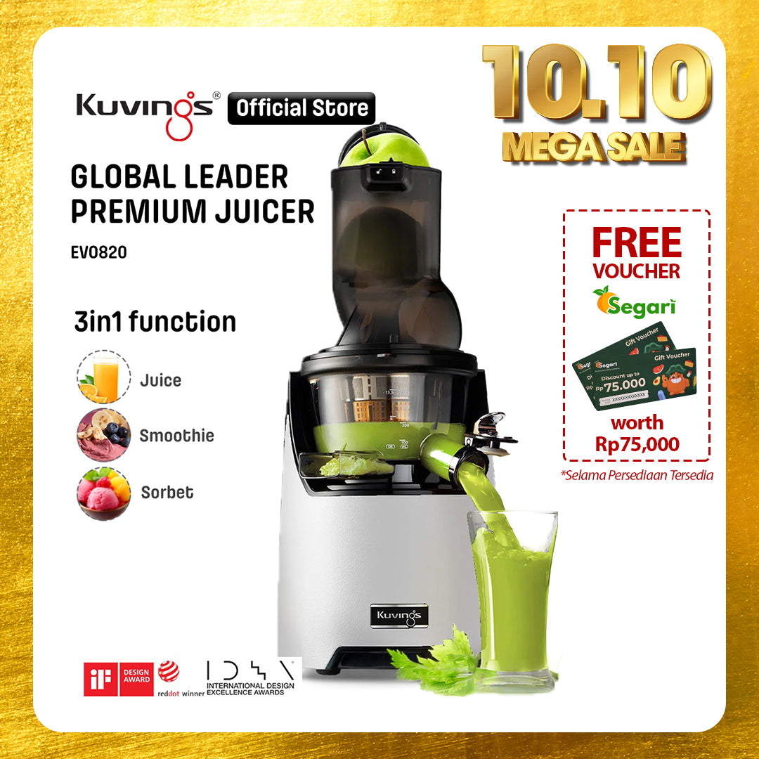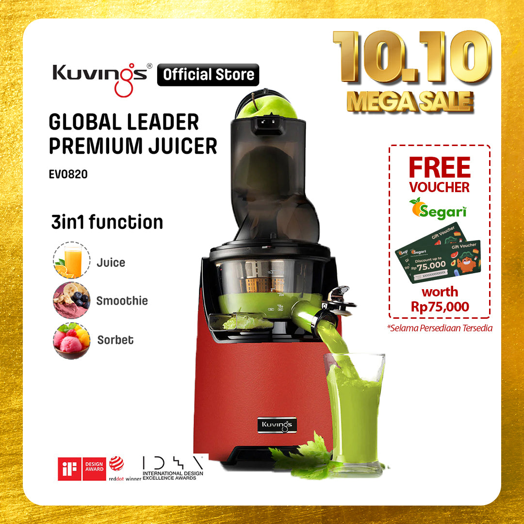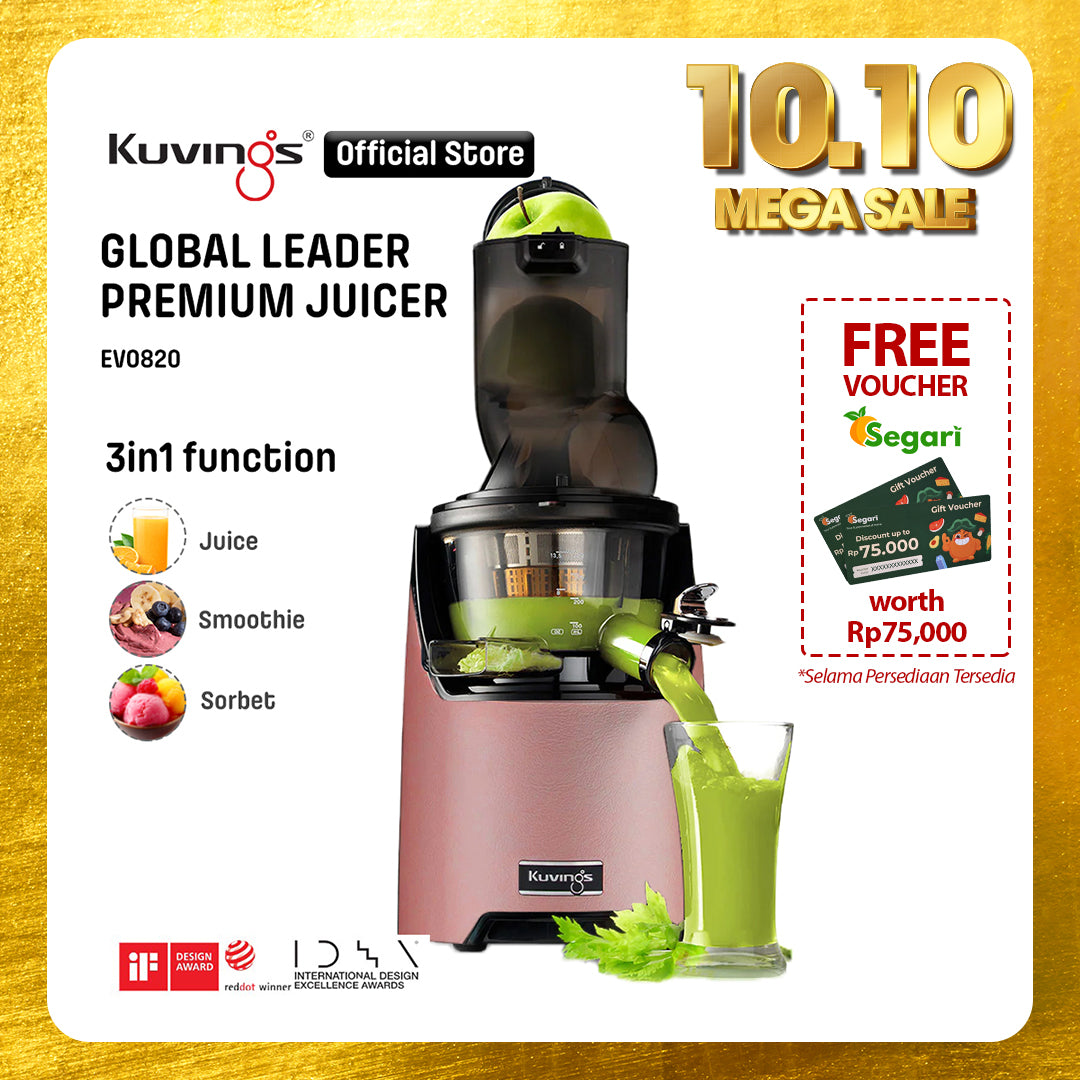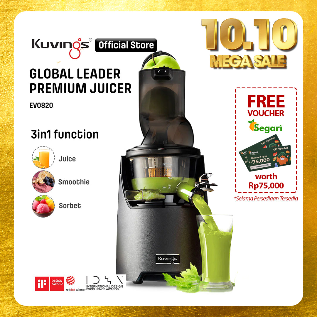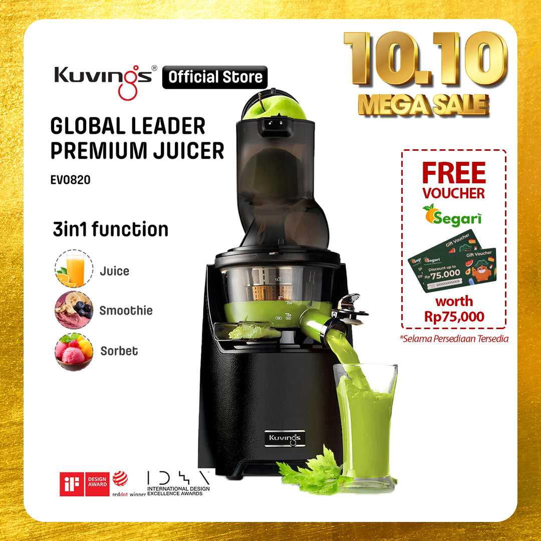 - Juicer Kuvings menyeragamkan sel tanaman dalam proses memeras bahan dengan lembut sehingga dapat diserap 3,8 kali lebih cepat oleh tubuh dan nutrisi pada buah dan sayuran.